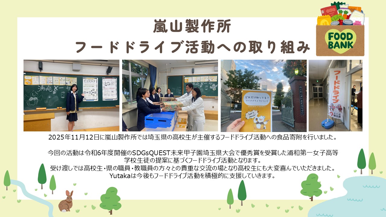 2025年11月12日に嵐山製作所では埼玉県の高校生が主催するフードドライブ活動への食品寄附を行いました。